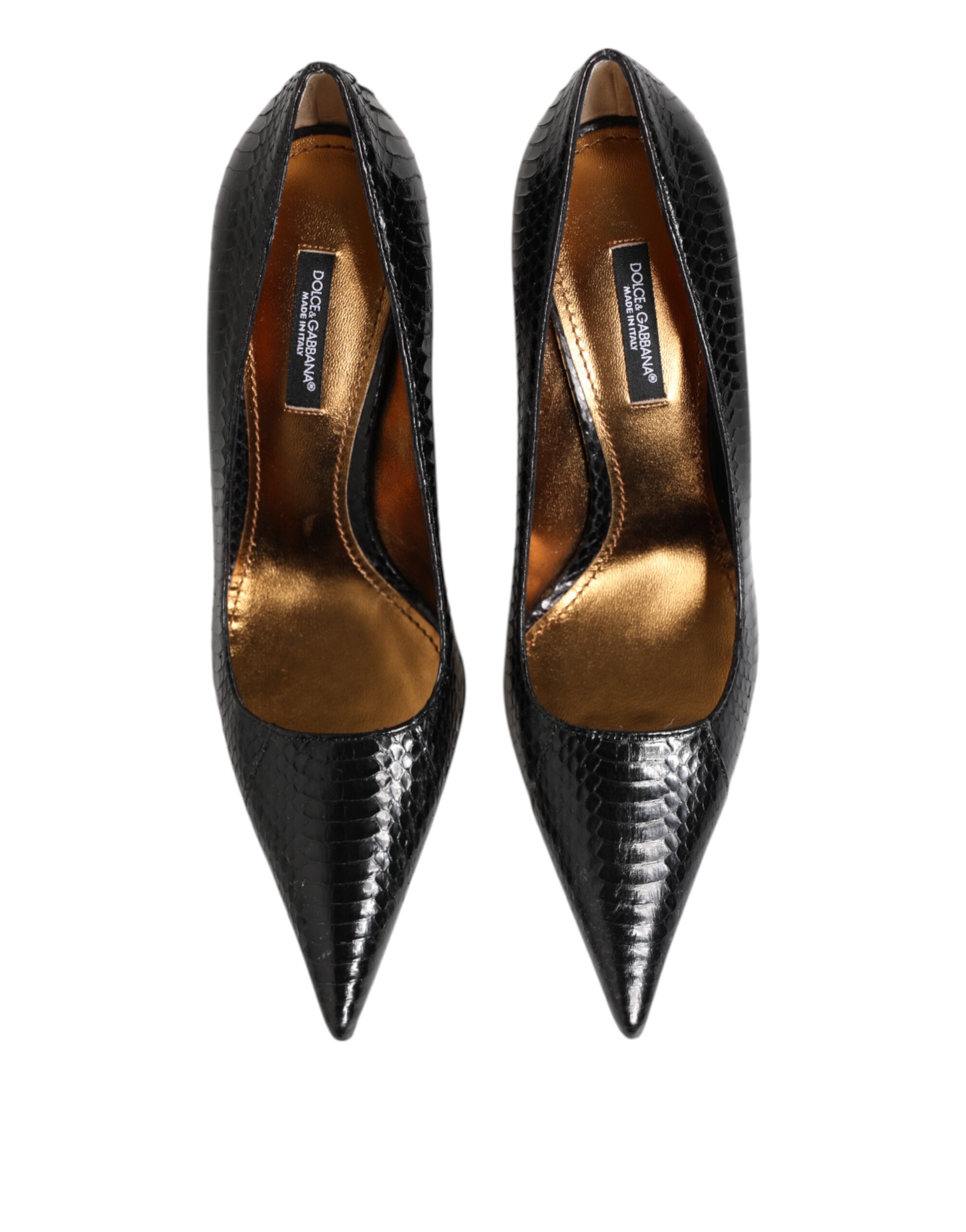 Gorgeous brand new, 100% Authentic Dolce & Gabbana python skin pumps are an elegant addition to your closet. With sharp lines, a pin-thin stiletto heel, and a golden DG metal logo, this timeless pair offers endless wearability. Model: Heels pumps Color: Black Material: 100% Python Leather Leather bottom sole Logo details Made in Italy Very high quality and comfort.