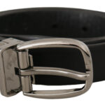Black Leather Chrome Logo Metal Buckle Belt
