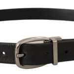 Black Leather Silver Chrome Metal Logo Buckle Belt