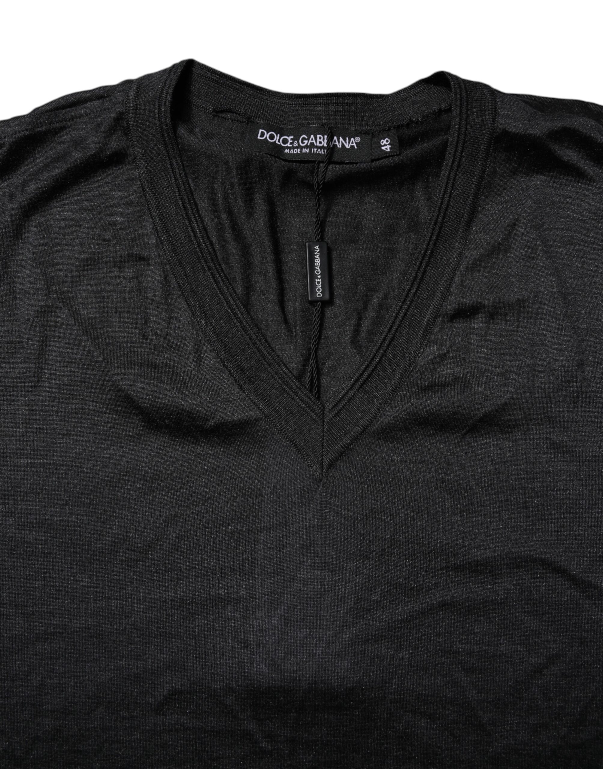 Dark Gray Silk V-neck Short Sleeves T-shirt