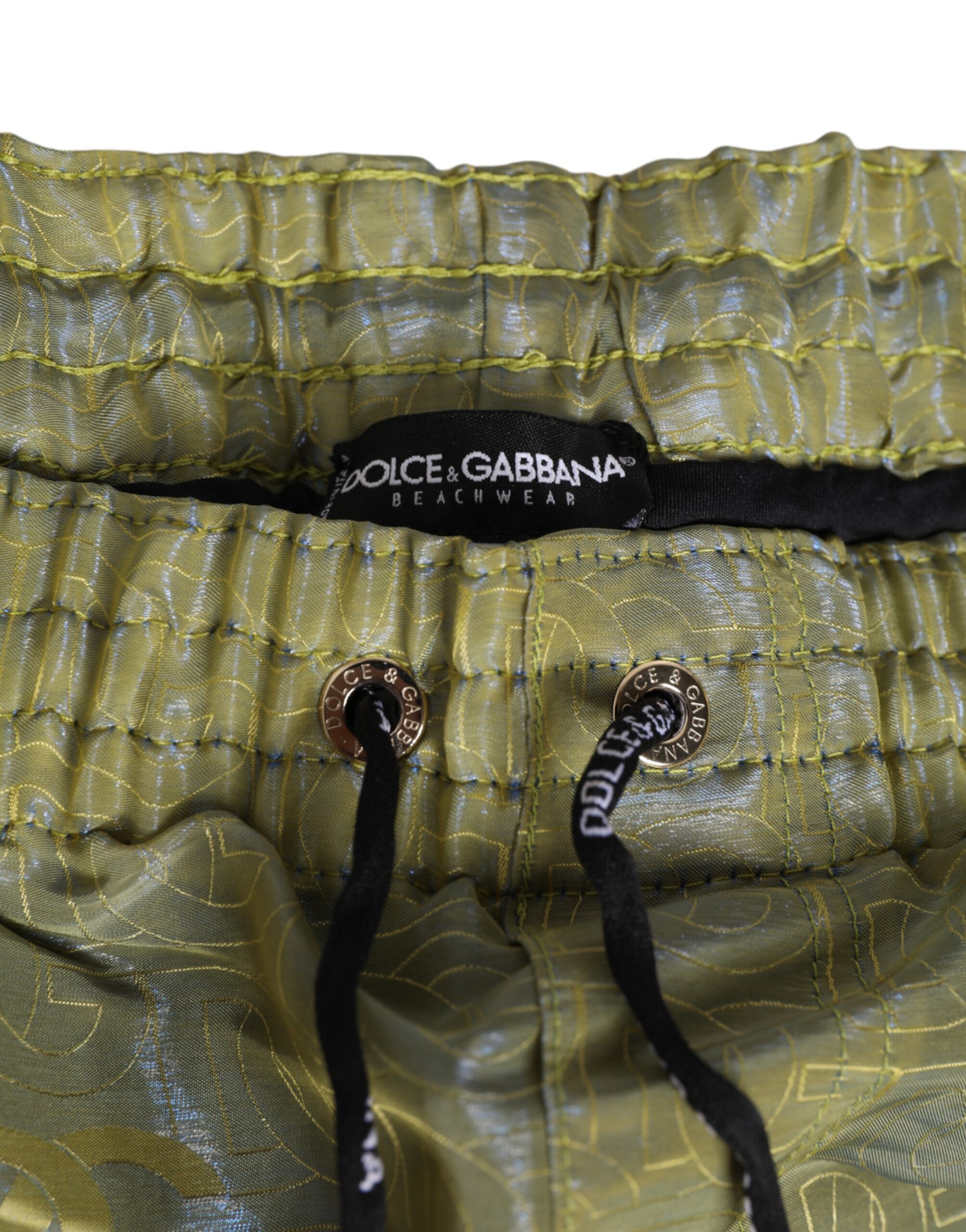 Green Polyester Metallic Logo Print Men Swimwear
