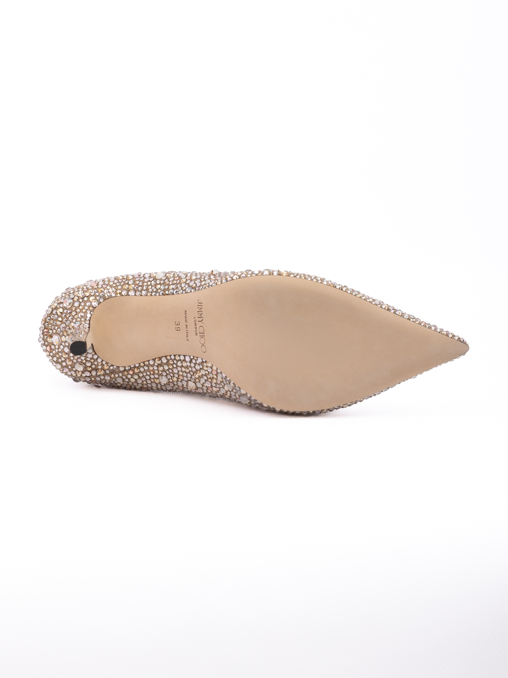 100% Authentic Jimmy Choo Light Bronze Crystal Love 85 Pumps. Model: LOVE 85 Color: Light Bronze Material: Satin/ Glitter