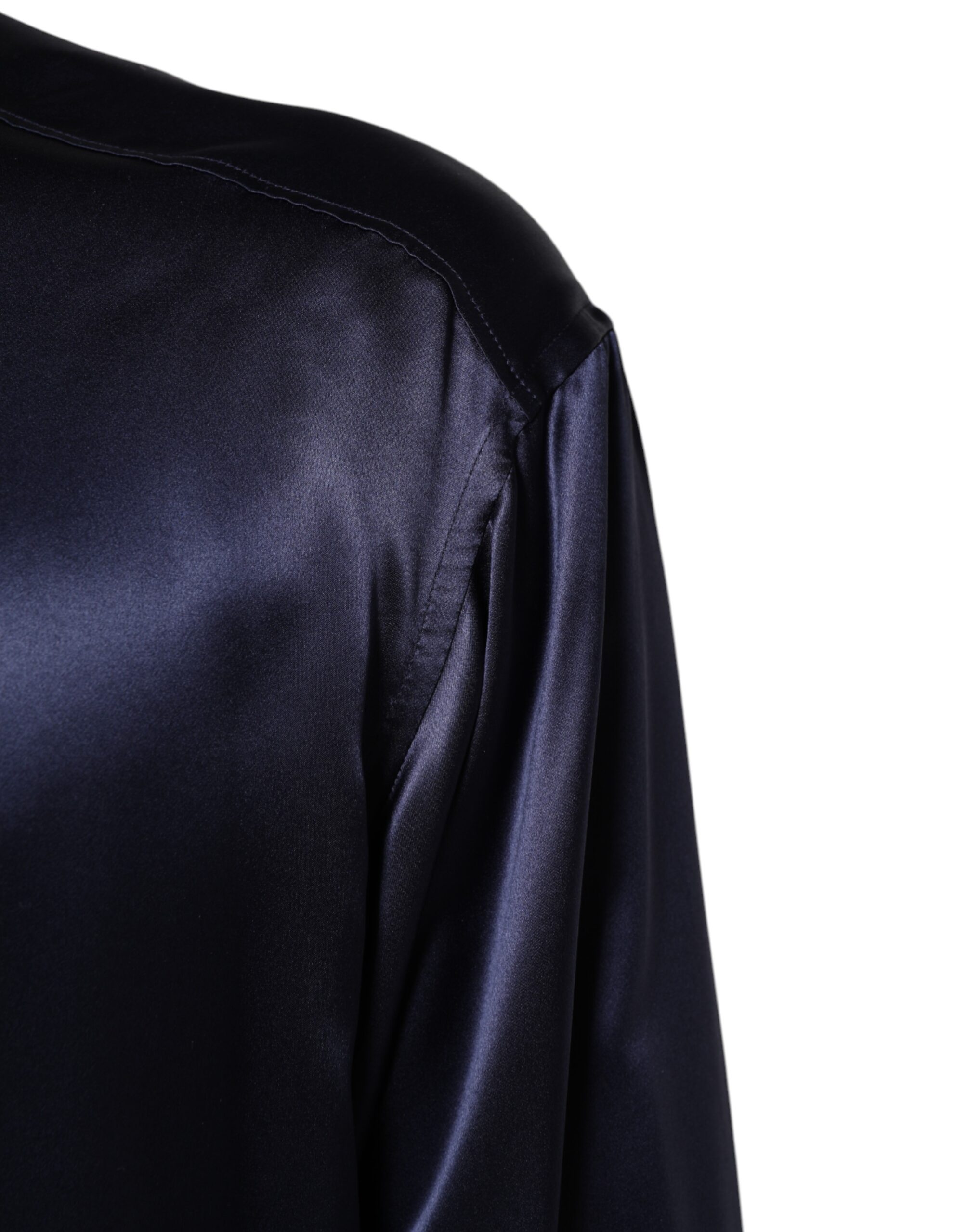 Navy Silk Long Sleeve Mandarin Collar Shirt
