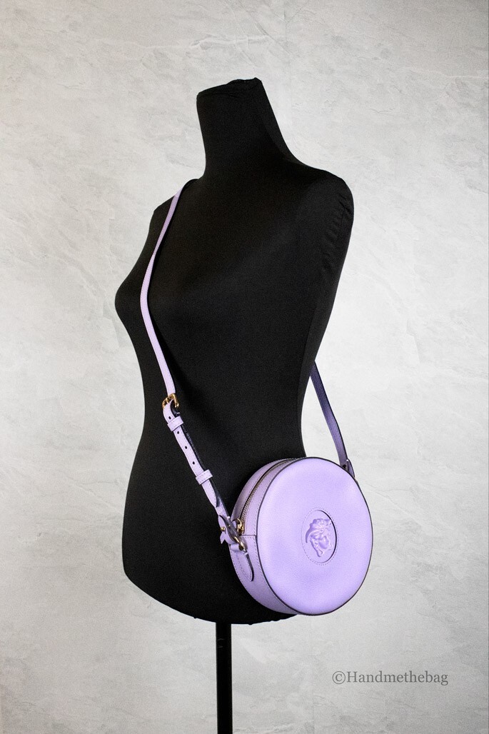 Versace Round Disco Lilac Pebbled Leather Camera Case Crossbody Bag Purse