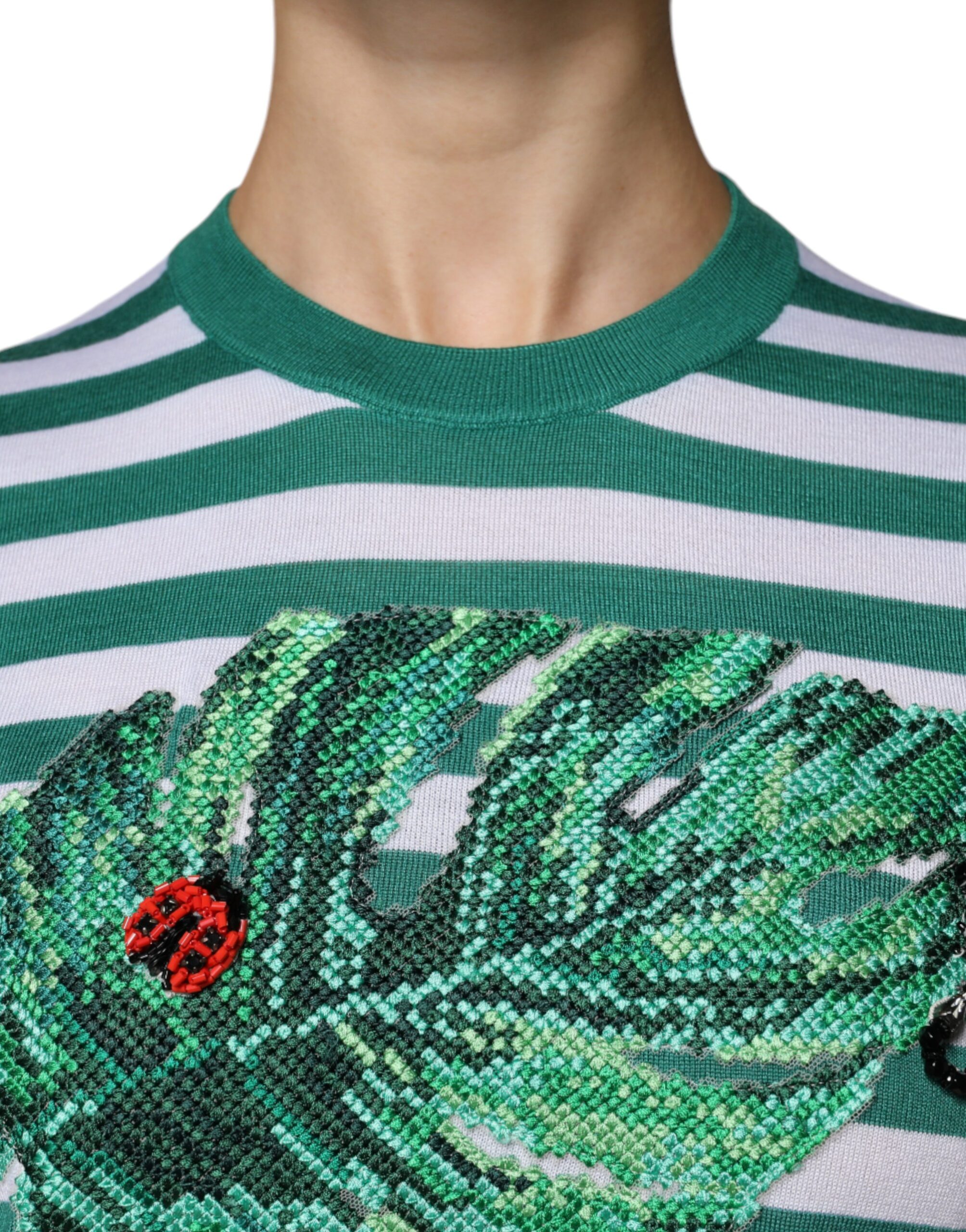White Green Stripe Leaf Crew Neck T-shirt