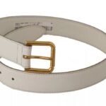 White Leather Gold Logo Engraved Metal Buckle Belt