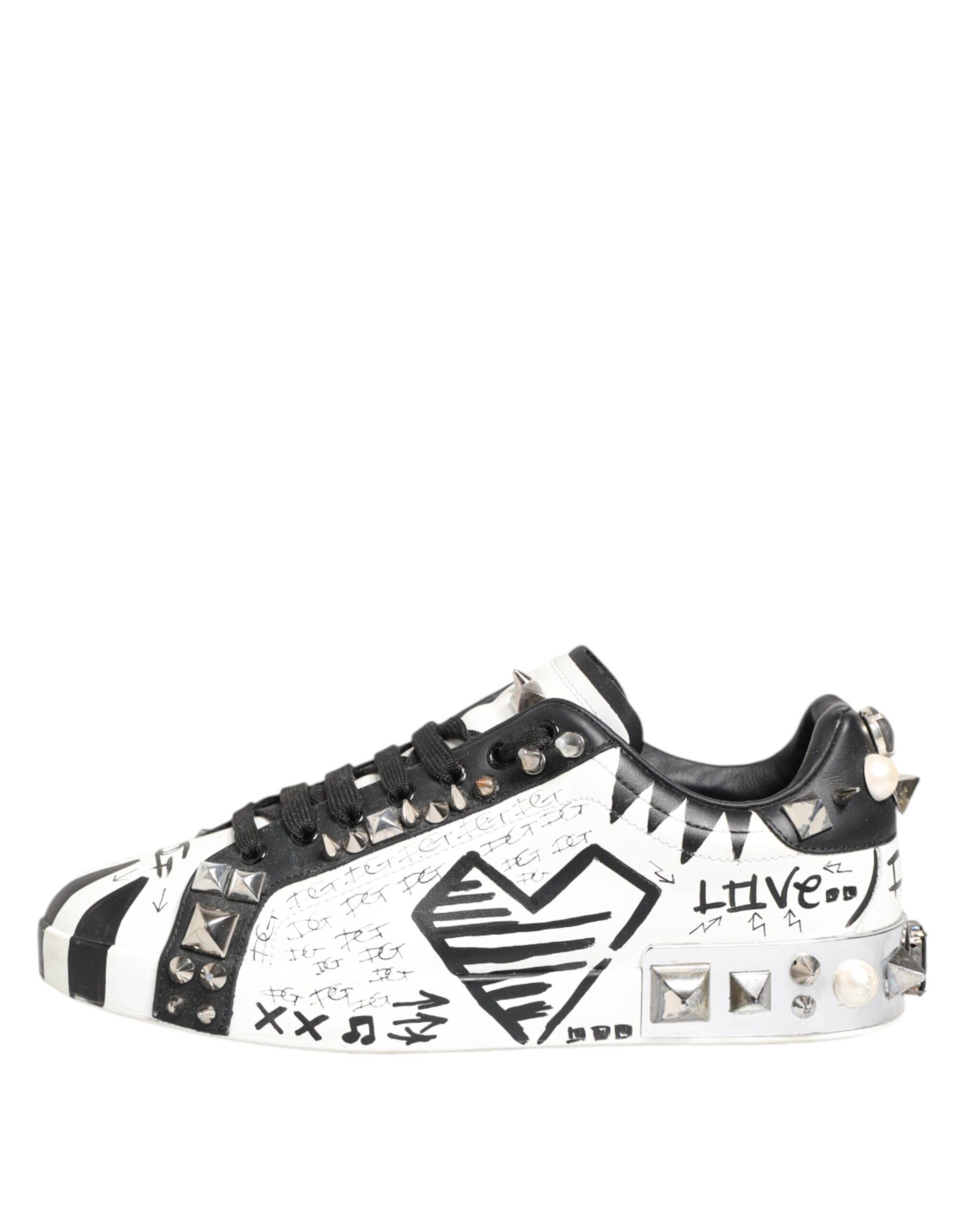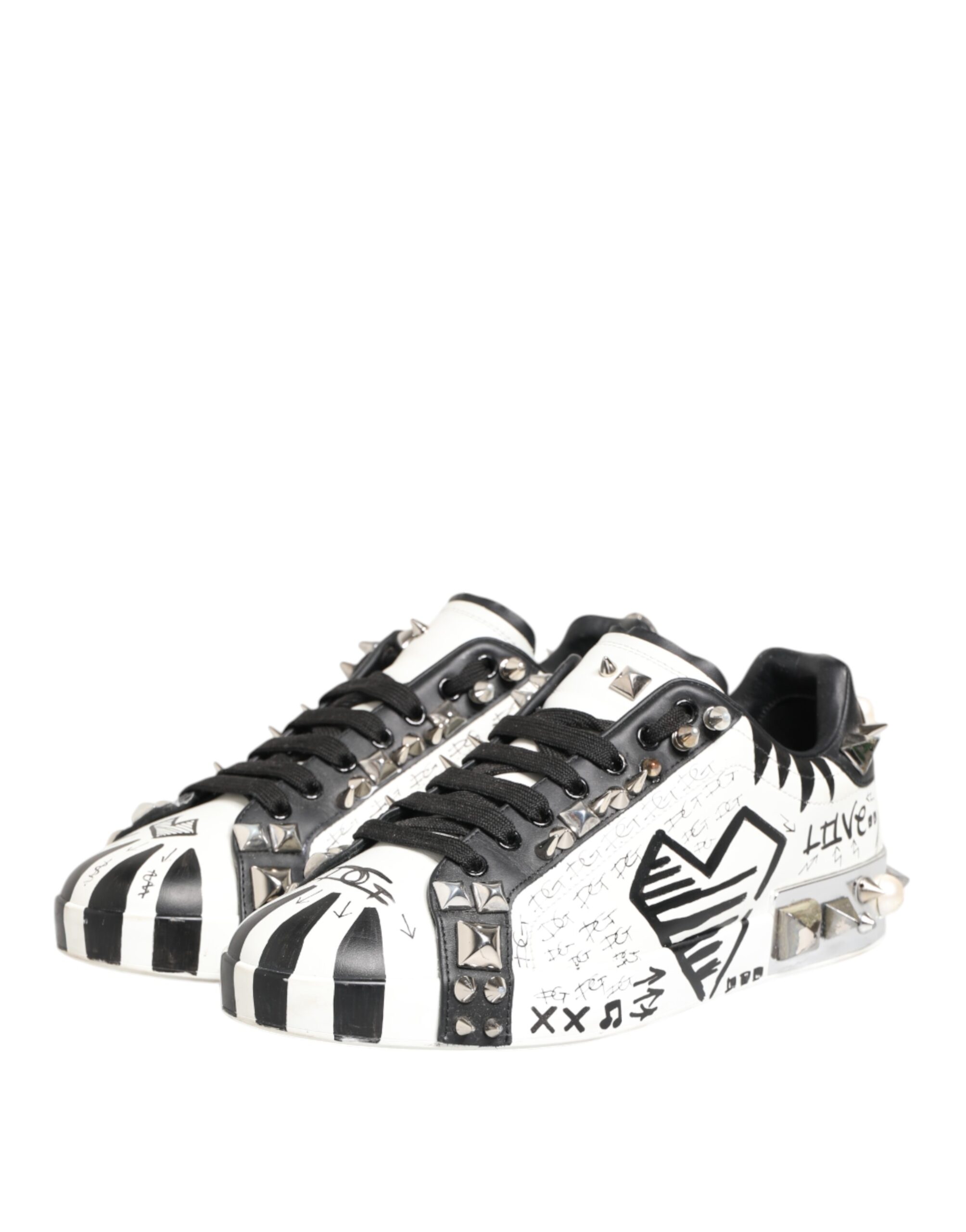Gorgeous preowned, 100% Authentic Dolce & Gabbana low-top sneaker features a logo print all over and metal studded, white sole and logo details. Model: Low top sneakers Color: White with print Material: 38% Polyester 34% Calfskin Leather 20% Nylon 5% Polyurethane 3% Elastane Rubber sole Lace up closure Logo Details Made in Italy Very exclusive and high craftsmanship
